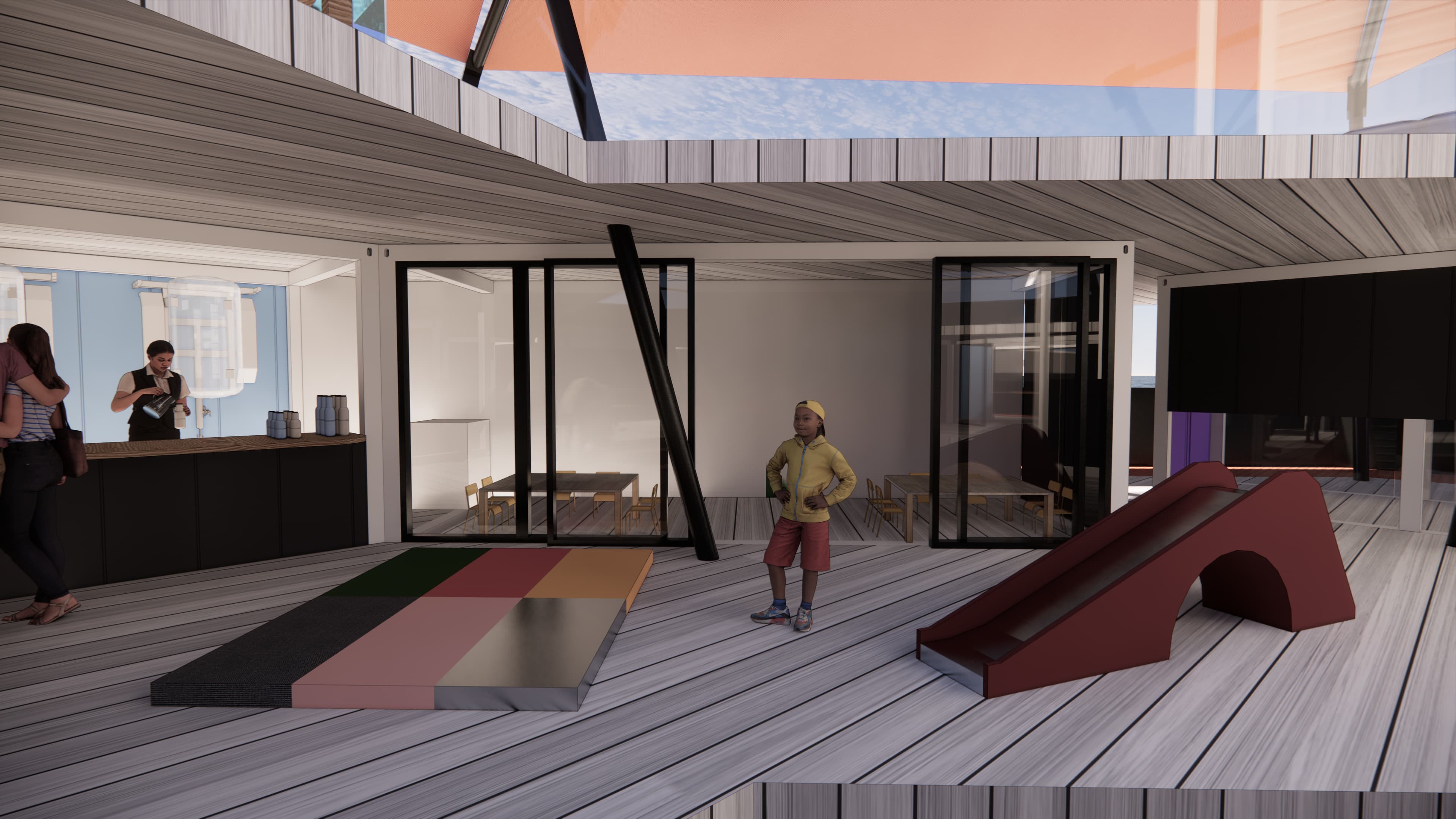 Octogon, Europe's first floating park. Hypothetically located on the Loire River in Nantes, this 700m² ecosystem welcomes city dwellers and travellers of all ages for a journey into the heart of the city. Multi-functional, it features a restaurant, a swimming pool, a gallery, an after-school club, a water bottle shop, aquaponics cultivation areas and a belvedere.